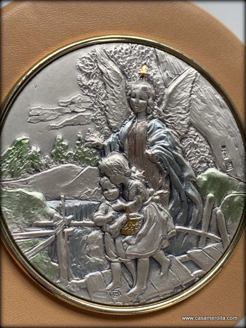 Bajorrelieve decorativo de forma redonda de placa de Plata 925º que representa Ángel de la guarda y dos niños cruzando el puente . Articulo de artesanía italiana, acabado del marco piel fina natural de color beige. Medidas de la placa 7,0 cm, exterior 10,0 cm. Disponibilidad : 1 un.