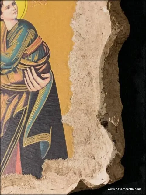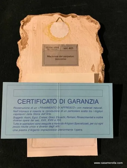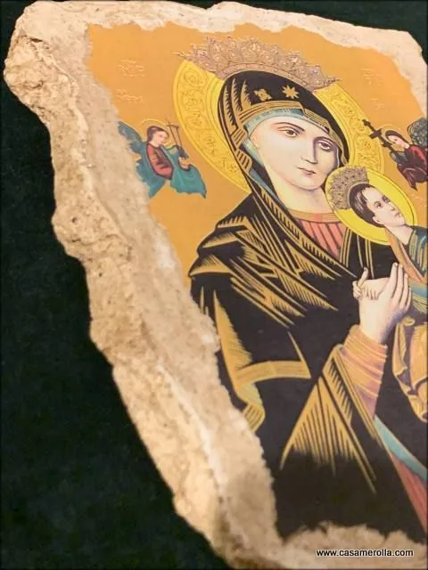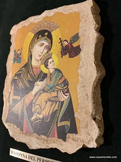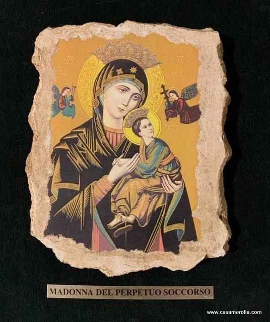 Representación de la obra Madonna del Perpetuo Soccorso ( Virgen del Socorro ) elaborada sobre la piedra natural por artesanos italianos. Medidas : 16 cm x 13 cm.