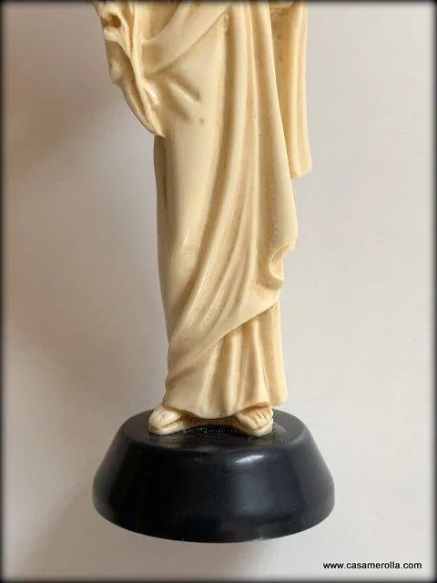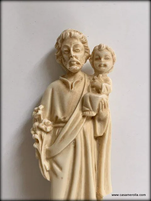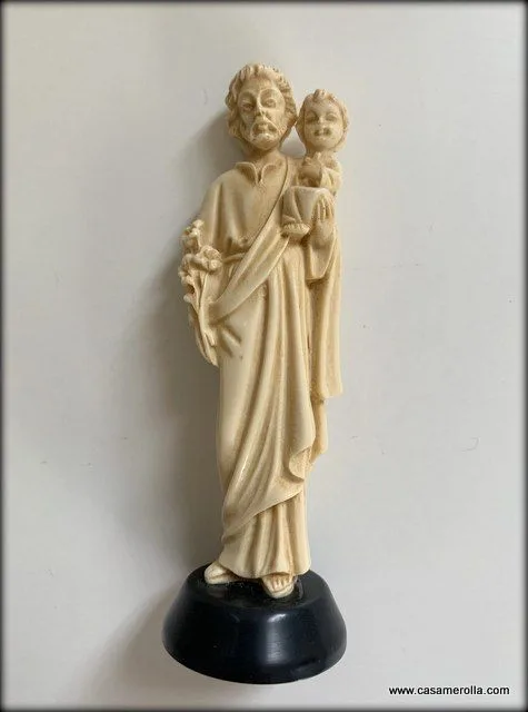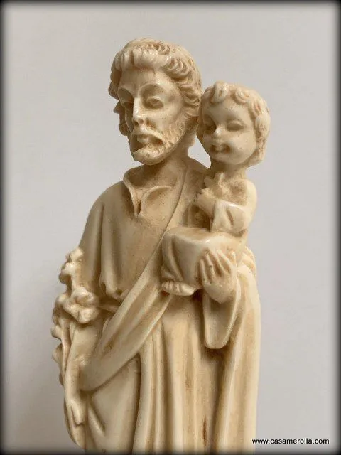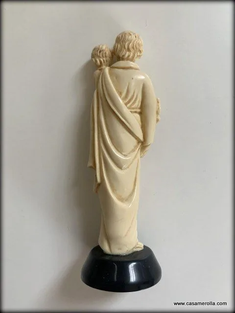 Figurita de San José con el Niño Jesús en brazos. Elaborada de marfilina sobre la base de piedra natural de color negro. Articulo hecho a mano. Medida : 9,3 cm