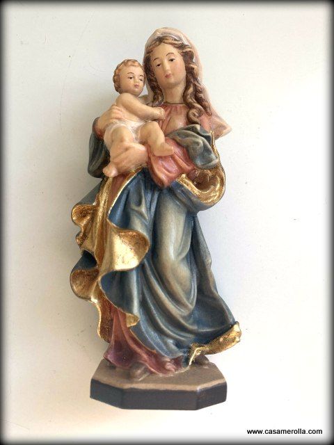 * Estatua de la imagen de la Virgen María con el Niño elaborada en pasta de madera italiana. Articulo hecho y pintado a mano , artesanía italiana Dolfi. Medida : 14,0 cm.