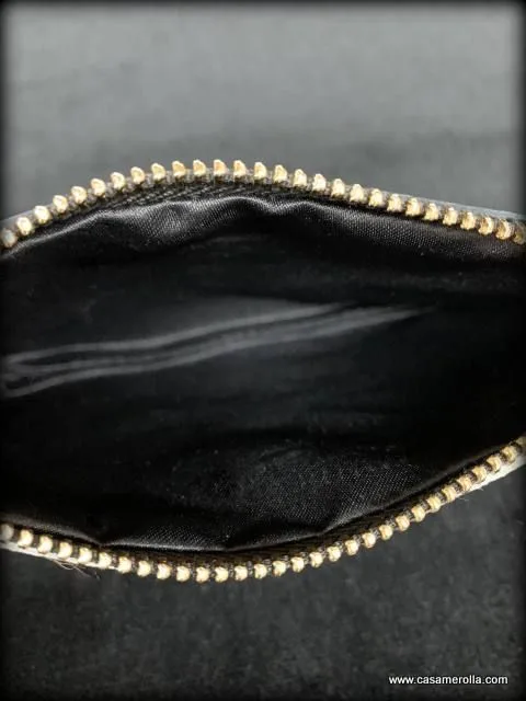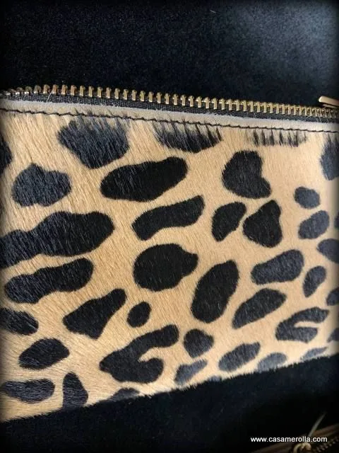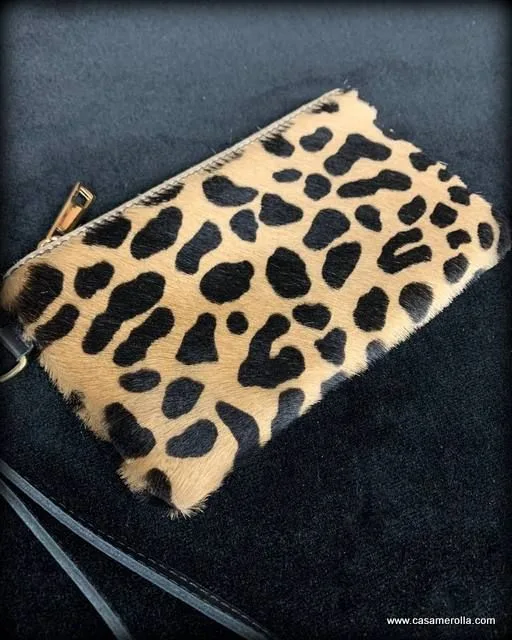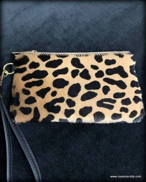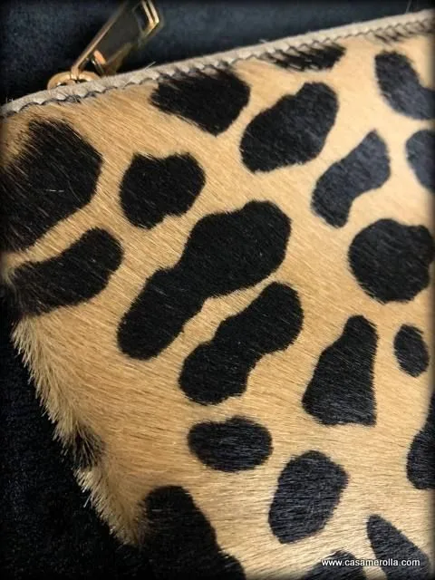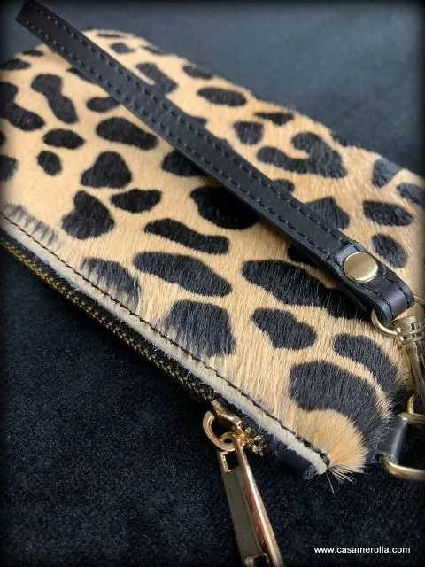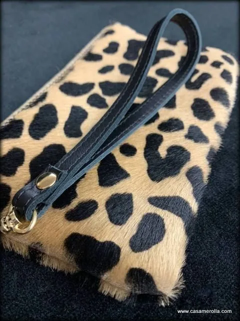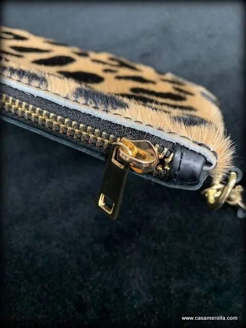 Neceser con asa de piel genuina (cordero) estampado animal con cremallera y elementos dorados. Producto artesanal elaborado en Italia. Medidas : Largo 19,0 cm, Alto 11,5 cm.