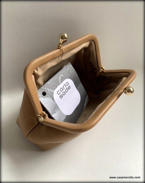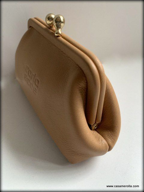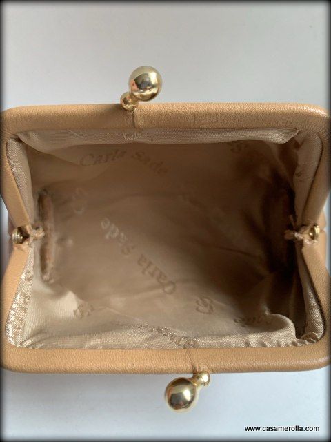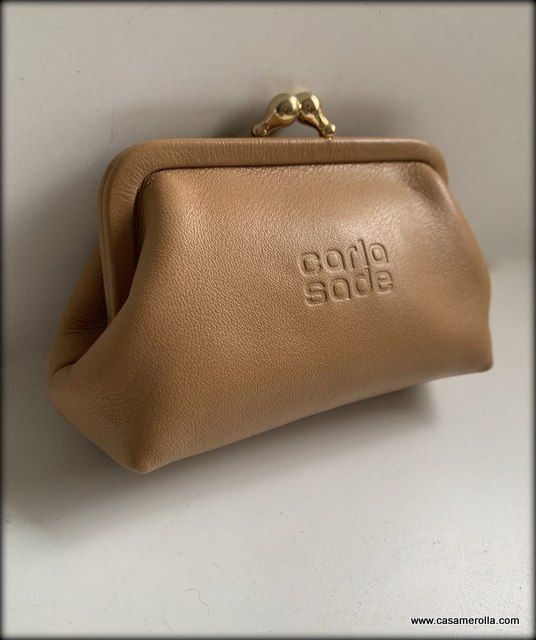 * Monedero de estilo vintage , elaborado de piel natural de color beige con elementos de metal dorado . Articulo de alta calidad de Carla Sade. Medidas : 12 x 7 x 4 cm. Disponibilidad : 1 un.