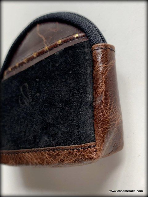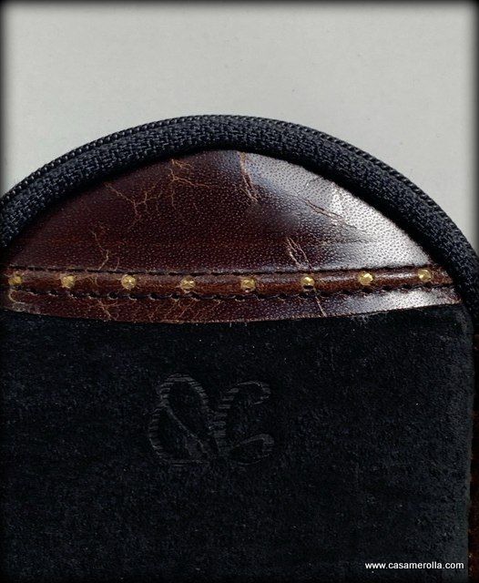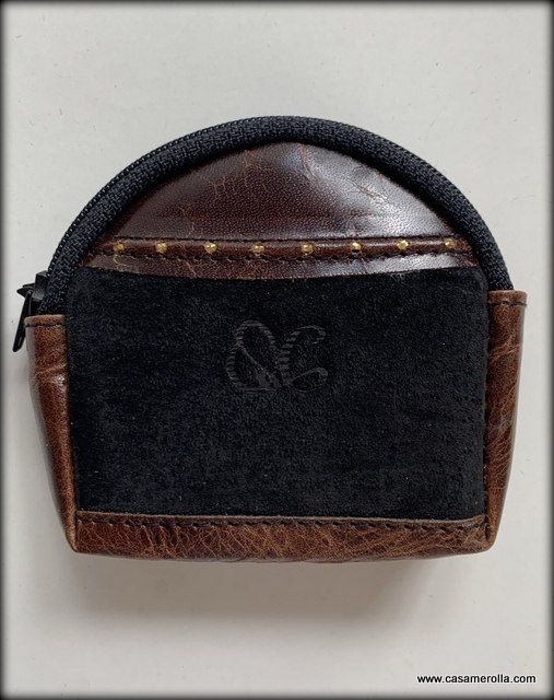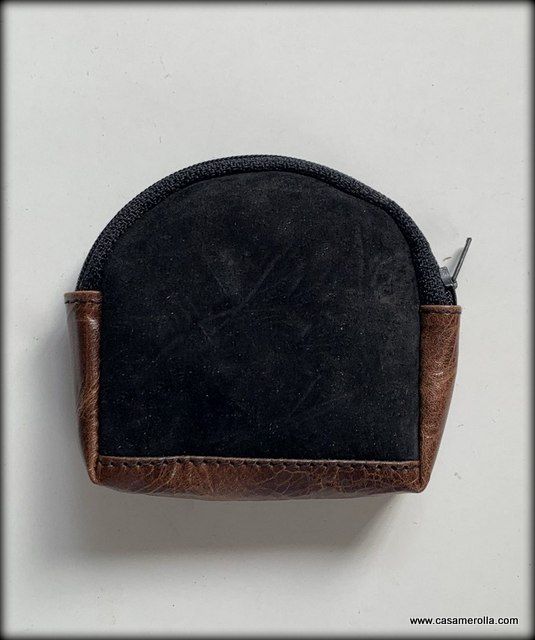 * Monedero vintage realizado en ante negro y piel natural de color marrón con logo y cremallera, articulo artesanal. Medidas : 8,5 x 7,5 cm.