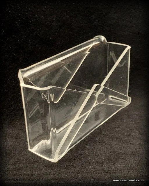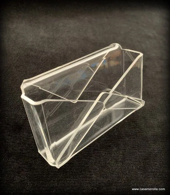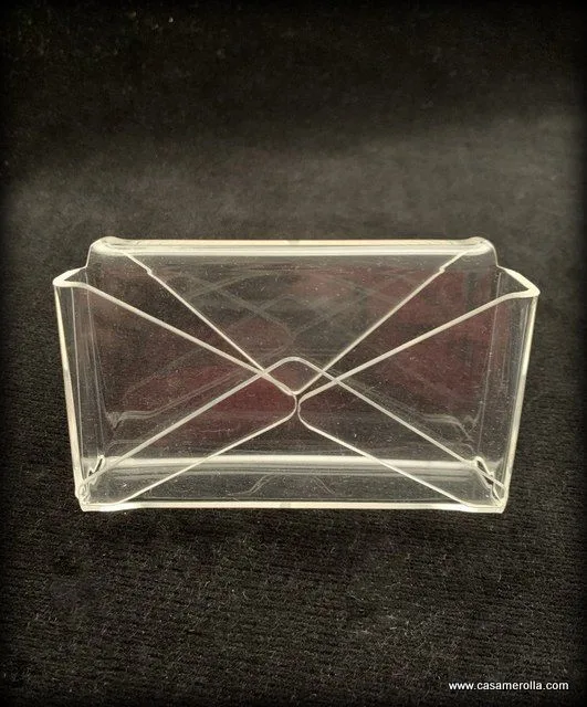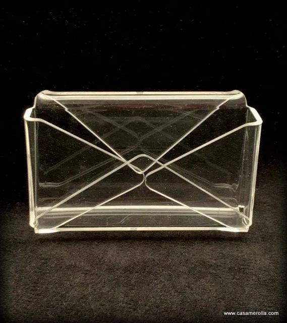Tarjetero transparente sobremesa en forma de sobre. Medidas : 10,5 x 8,0 x 2,0 cm.