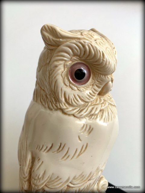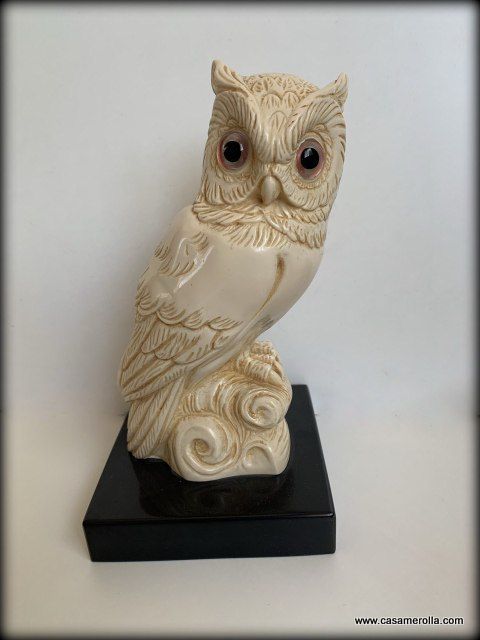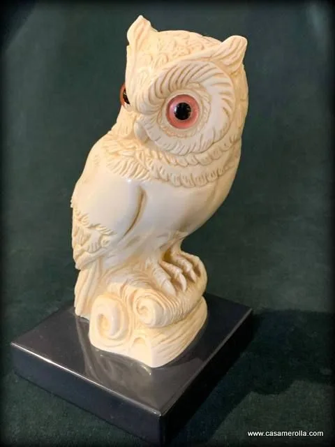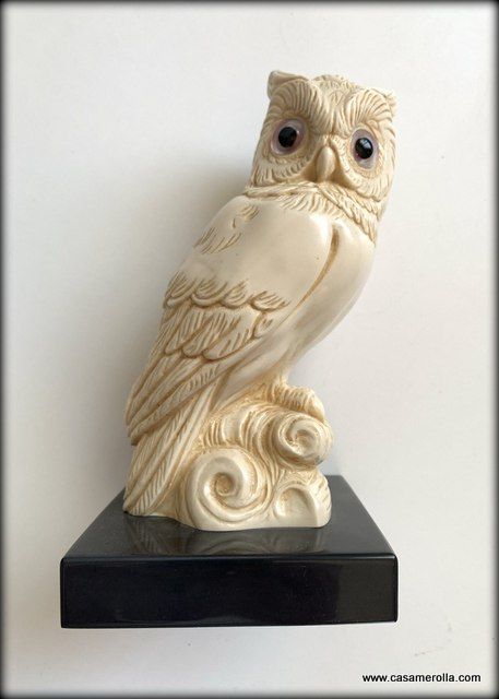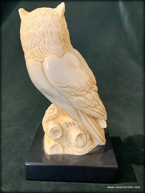 Búho blanco , estilo marfilina sobre la base de mármol negro. Producto artesanal, hecho en Italia.