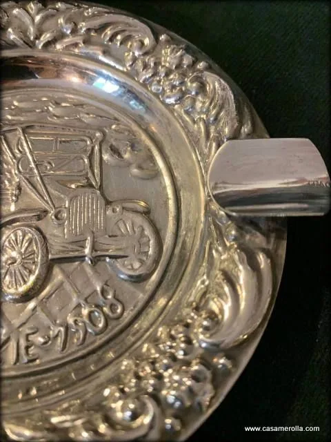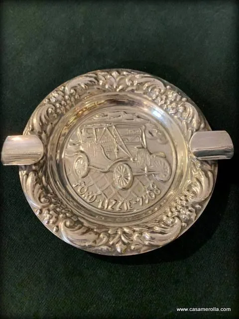 Cenicero redondo de Alpaca Plateada con inscripción ,,Ford Lizzie 1908,, Producto artesanal de colección.                    Medidas : diámetro  11,3 cm .