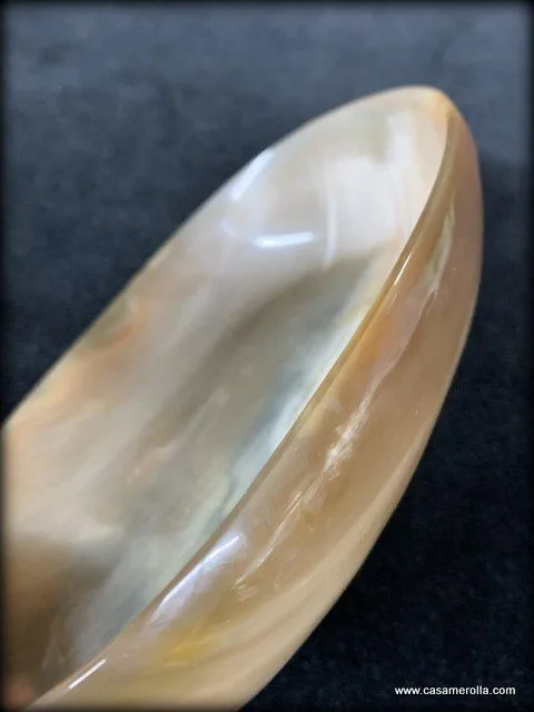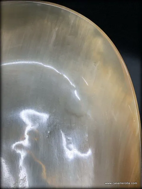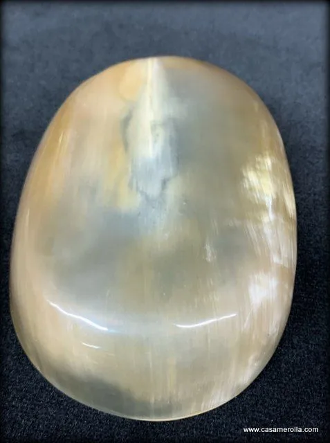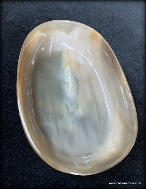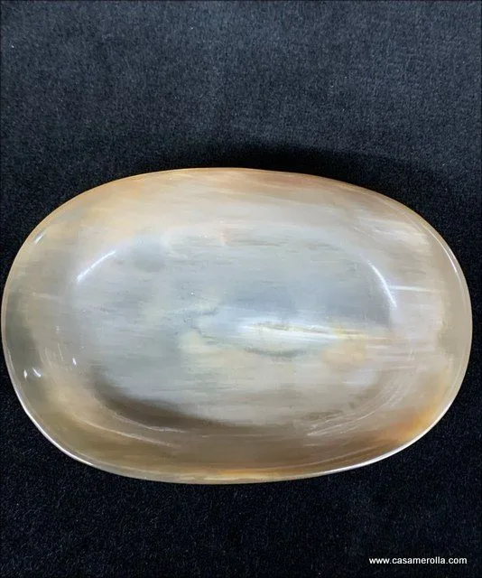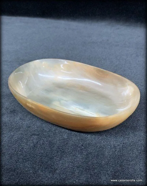 Jabonera de cuerno natural de forma ovalada , hecha a mano . Medidas : 15,2 x 10,3 x 3,0 cm .