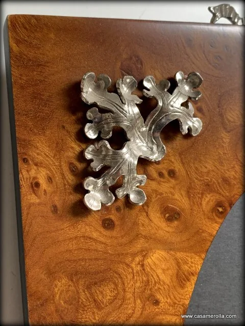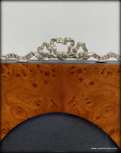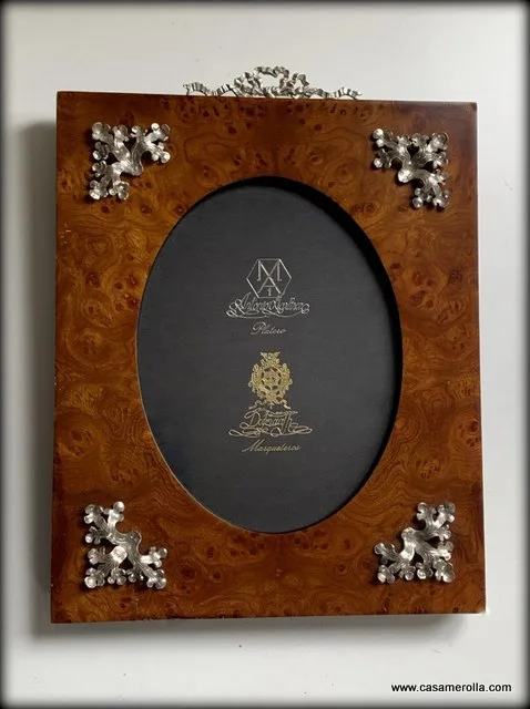 Marco de madera noble de raíz con elementos decorativos elaborados en Plata de Ley 925º . Trabajo de artesanos de marquetería y el platero Antonio Martínez . Único y exclusivo articulo de colección. Medidas : Interior 15 x 20cm. Exterior 23,0 x 28,0 cm.
