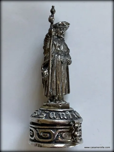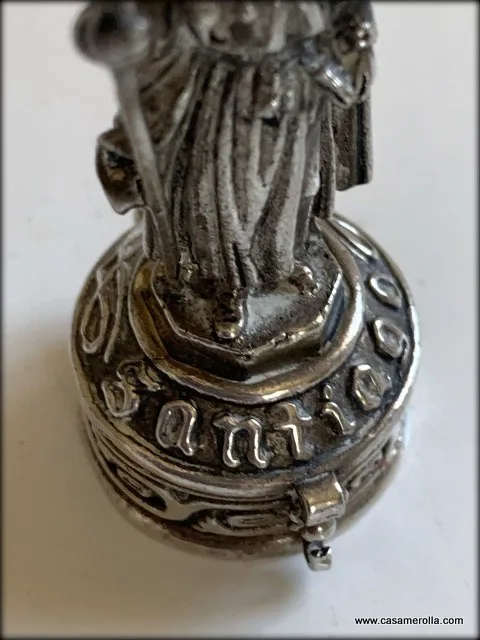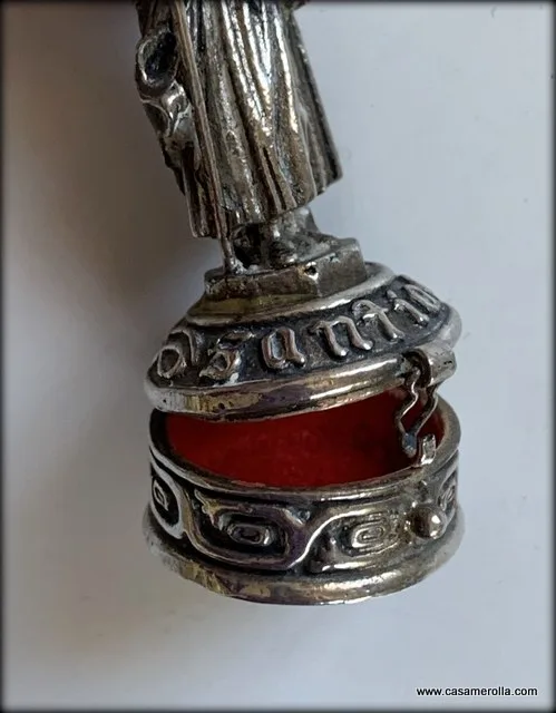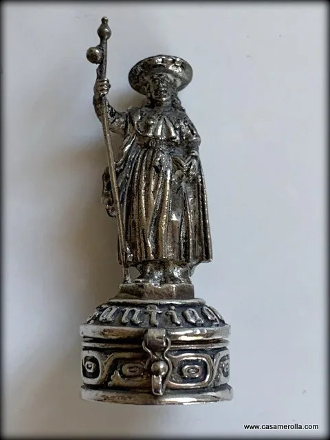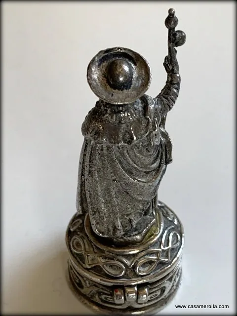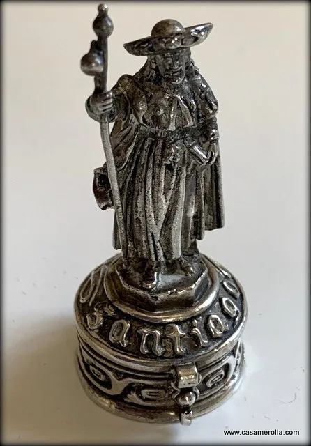Pastillero vintage de alpaca con figurita de Santiago hecho a mano.