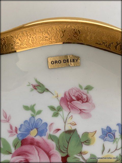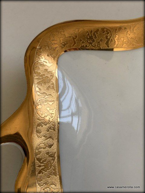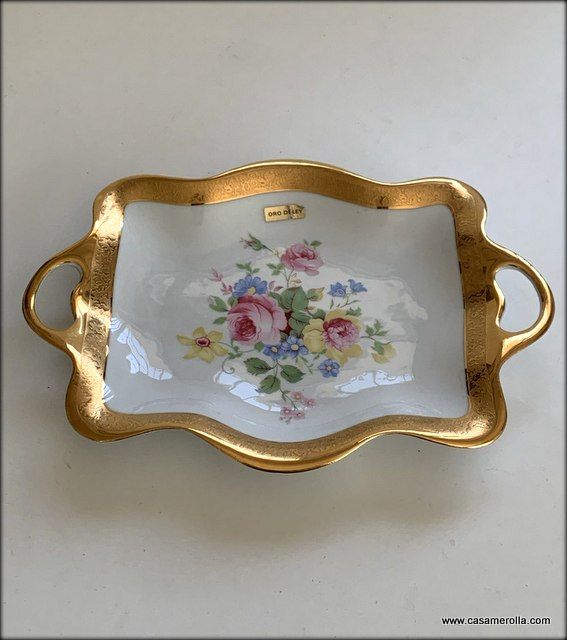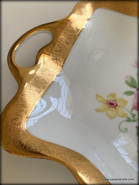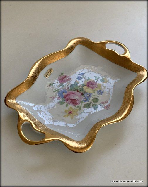 * Plato de colección de porcelana con asas y bisel de Oro de 24K . Articulo de artesanía española, pintado y decorado a mano . Medidas : 24,5 x 18,0 cm.