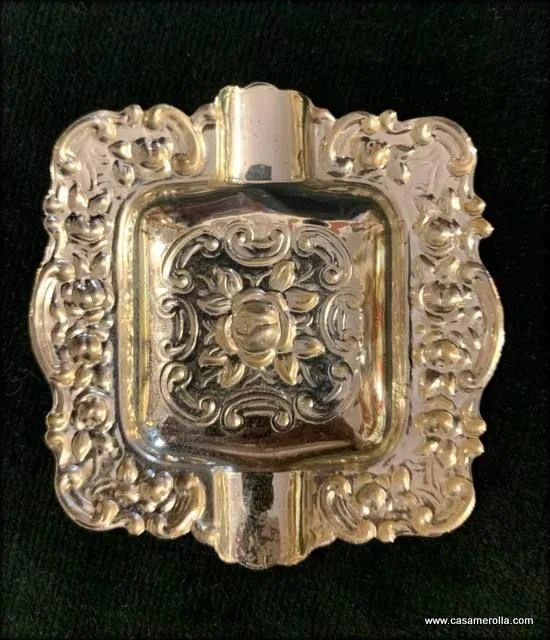 Cenicero de forma cuadrada de Alpaca Plateada repujada para dos puros , articulo de colección individual . Producto artesanal . Medidas : 5,5 cm x 5,5 cm.