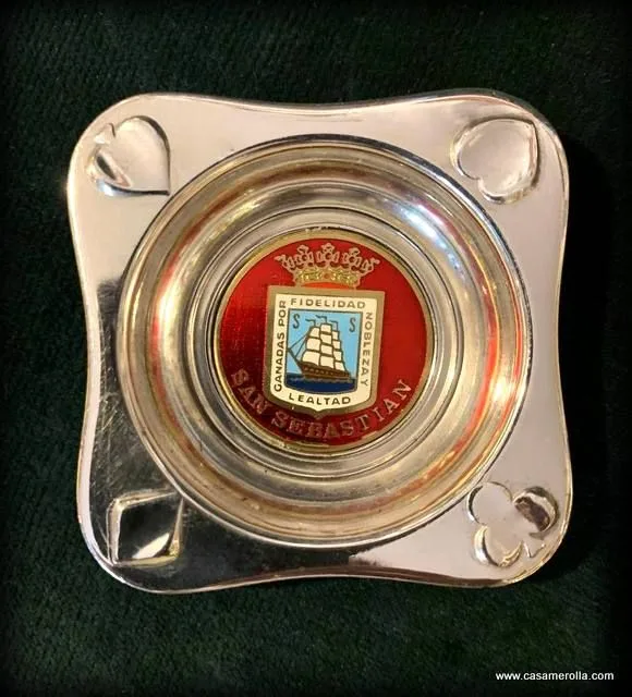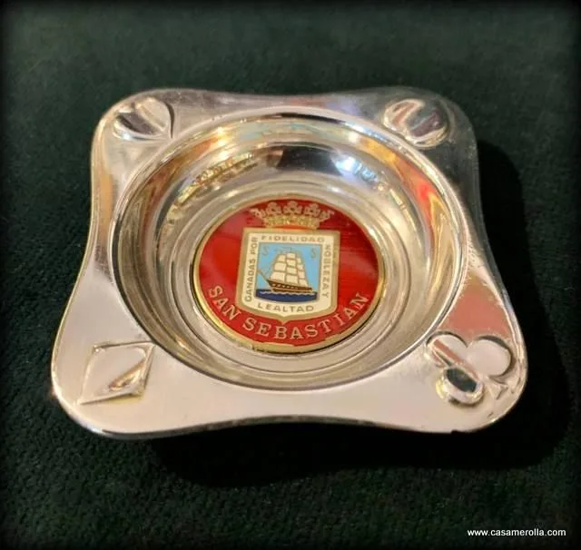 Cenicero cuadrado de Alpaca Plateada para cuatro puros ,,San Sebastián,, , articulo de colección individual elaborado artesanalmente. Medidas : 5,5 cm x 5,5 cm.