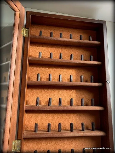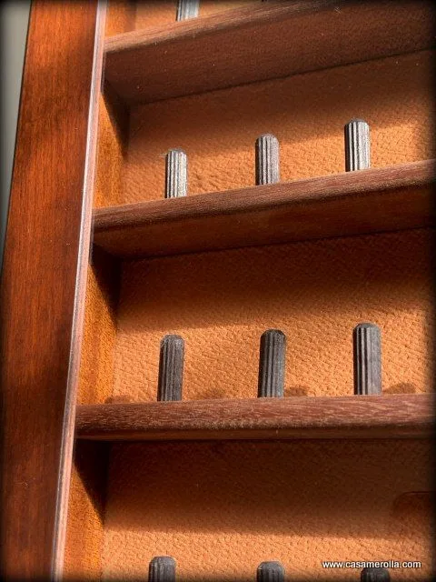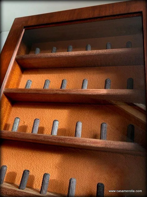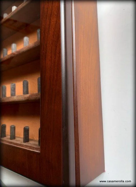 Vitrina de madera noble con puerta acristalada , el fondo aterciopelado de color beige tostado y cierre magnético. Articulo hecho completamente a mano. Medidas : 43,0 x 25,0 x 6,5 cm.