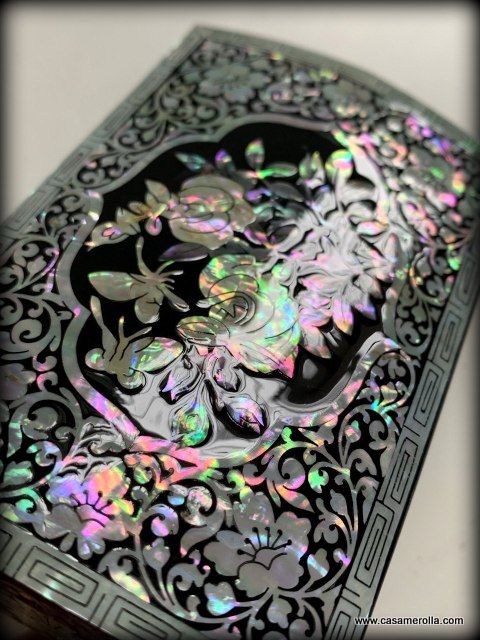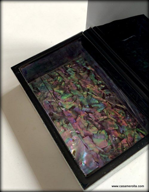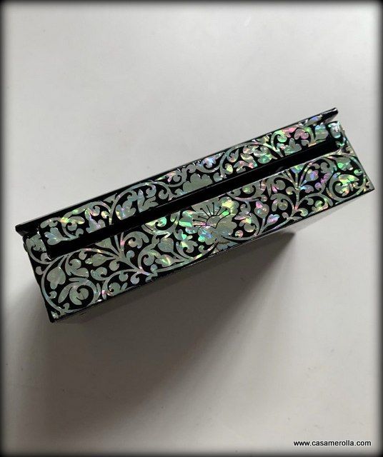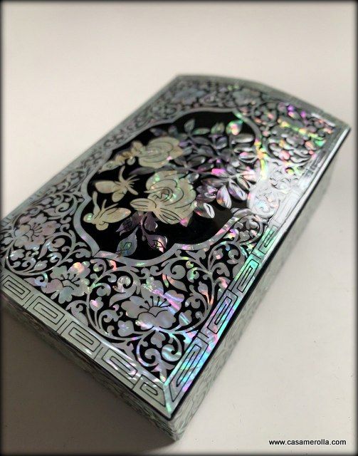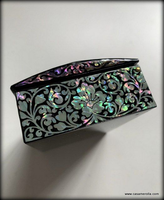 Cajita lacada de artesanía coreana con incrustaciones de nácar , articulo original y de estilo tradicional de Korea. Medidas : 10,5 x 7,2 x 3,5 cm.