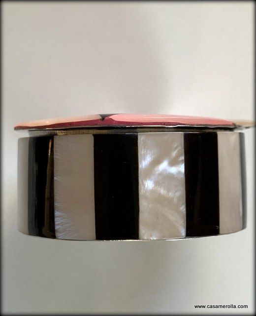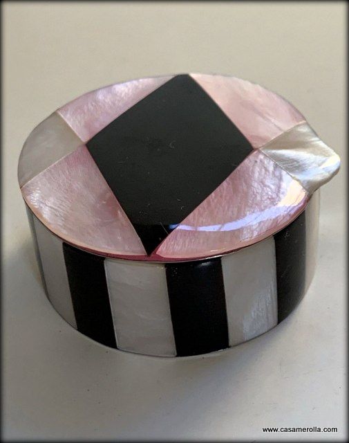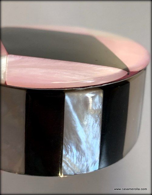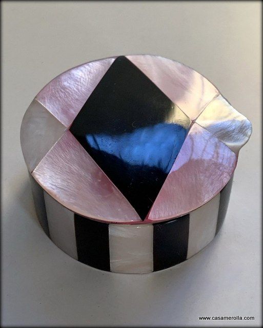 * Cajita decorativa filipina de forma redonda con tapa, elaborada en nácar natural de colores. Articulo hecho a mano. Medidas : 5,2 x 2,5 cm. Disponibilidad : 1 un.