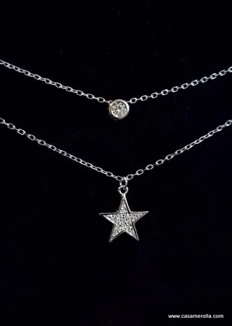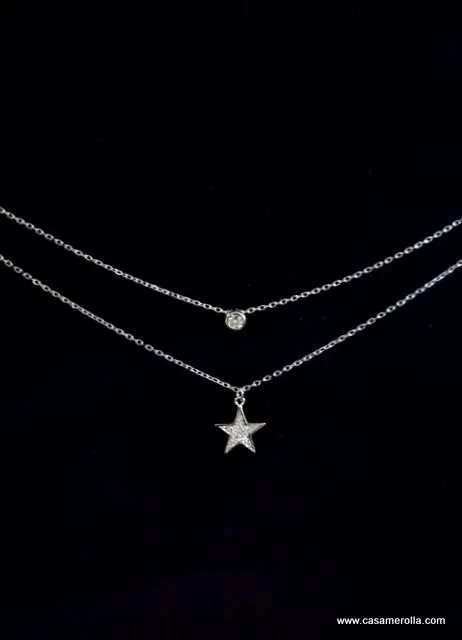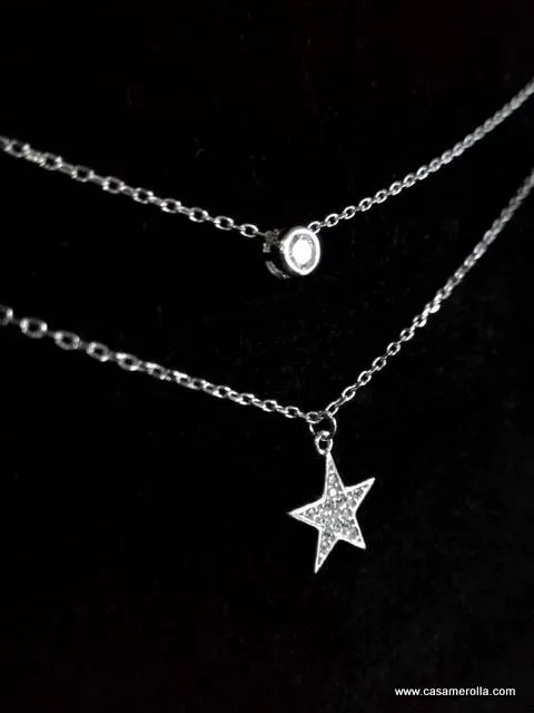 Gargantilla doble fabricada en plata  ( Primera de Ley ) de 925 con tratamiento de alta calidad en Rodio característica exclusiva que le aporta una elevada calidad de terminación y consistencia , así como un excelente brillo y elegante acabado simíl al Oro blanco de alta Joyería.   Características: Eslabón forzado en hilo grueso de 0,60mm con, Diseño estrella engastado en 1,3 cm con motivo Circonita de 0,4 cm                                                                                                                                       Dimensiones:  Longitud 37,00 cm , Extensión : 5,50 cm ,