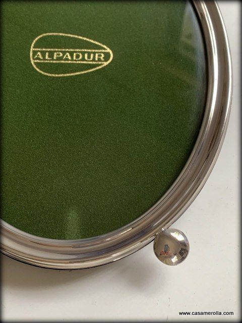 Marco de forma ovalada elaborado en Alpaca Plateada, modelo de mesa. Articulo artesanal de Pedro Duran. Medidas : exterior 21 x 28, interior 23,5 x 18,0 cm.