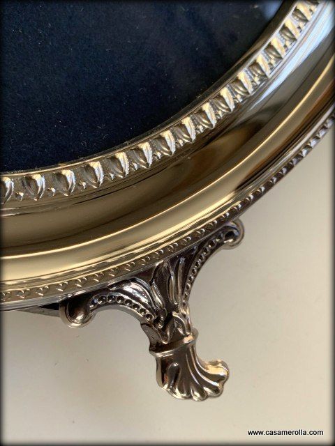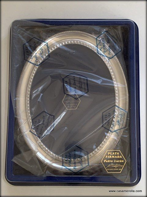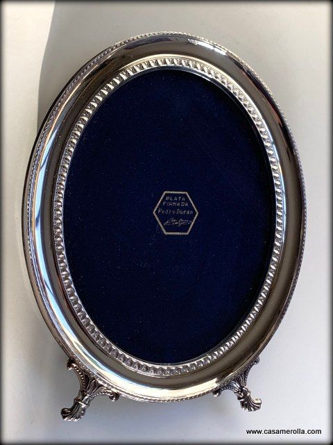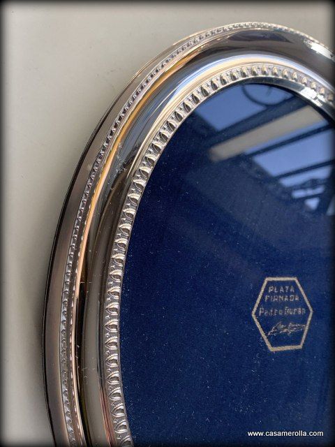 Elegante marco vintage de forma ovalada con patas, elaborado en Plata firmada , articulo artesanal de pedro Duran. Medidas : 30 x 25 cm.