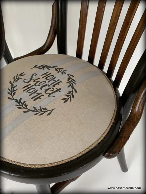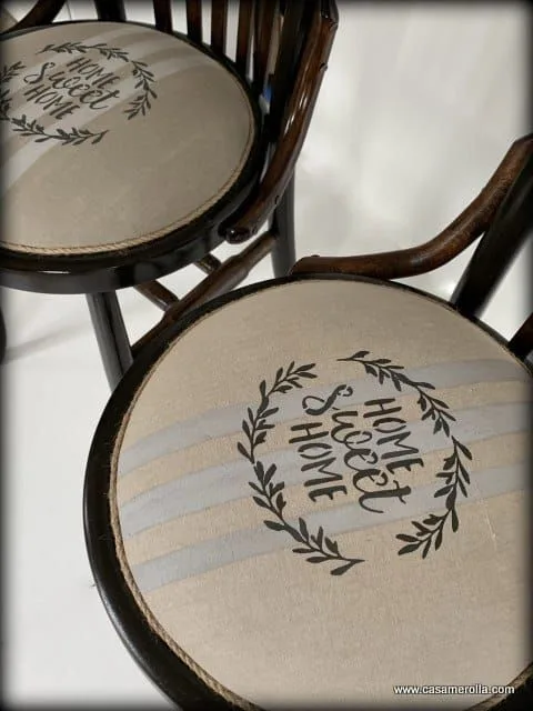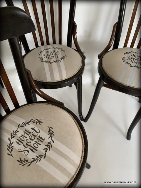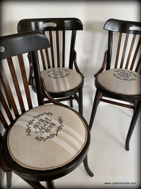 Conjunto de tres elegantes sillas antiguas vintage de madera noble con asientos tapizados con materiales naturales de varias tonalidades . Artículos artesanales hechas a mano .