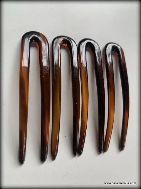 *Conjunto de cuatro horquillas de Carey concha hechas a mano. Medidas : 8,0 x 1,5 cm. Disponibilidad 2 un (x4).