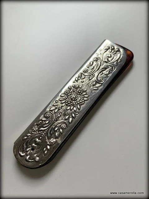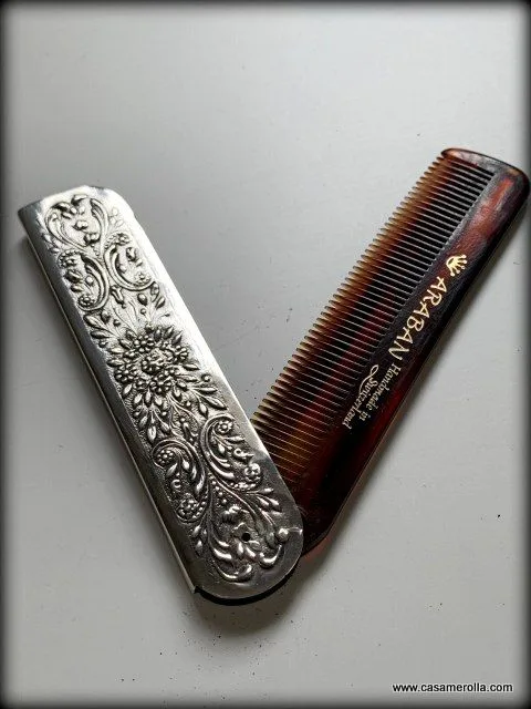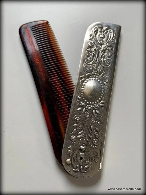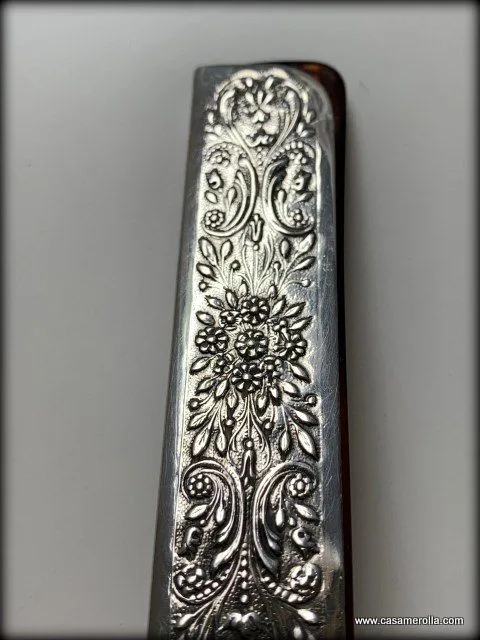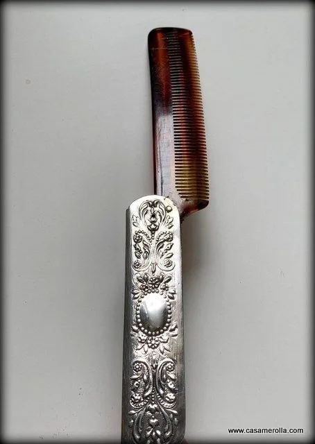 Peine de Carey ensamblado con montura de Plata 925 . Modelo para caballero. Articulo artesanal con opción de grabar los iniciales sobre la funda de Plata. Medidas : 10,5 x 2,5 cm.