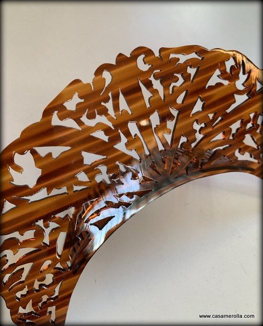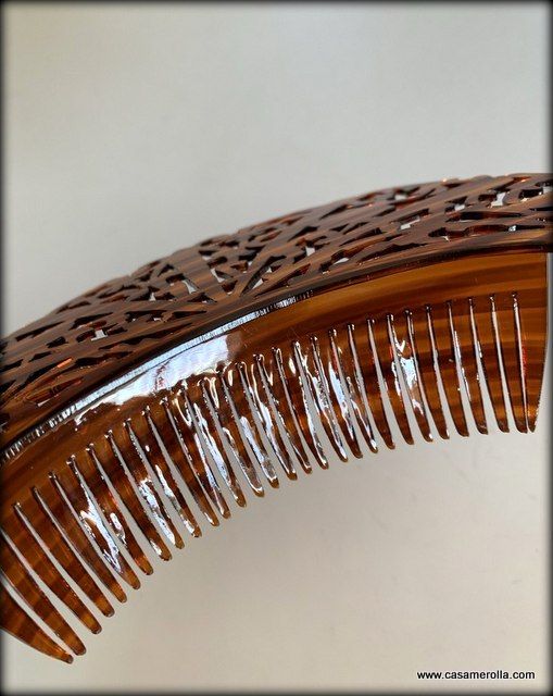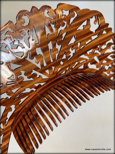 * Media peineta tradicional española elaborada en Carey , articulo artesanal, hecho a mano. Medidas de la peineta : alto 6,5 cm, ancho 18,0 cm. Las púas 12,0 x 4,0 cm. Disponibilidad : 4 un.