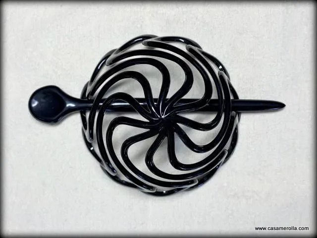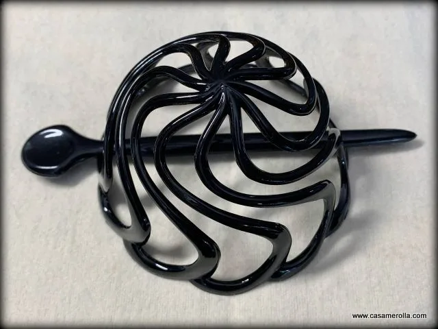 Jaula de moño para el pelo con palillo de color negro . Elegante diseño , producto de alta calidad . Medidas : Diámetro 8,5 cm, Fondo 5,5 cm , Longitud del palillo 13,5 cm.