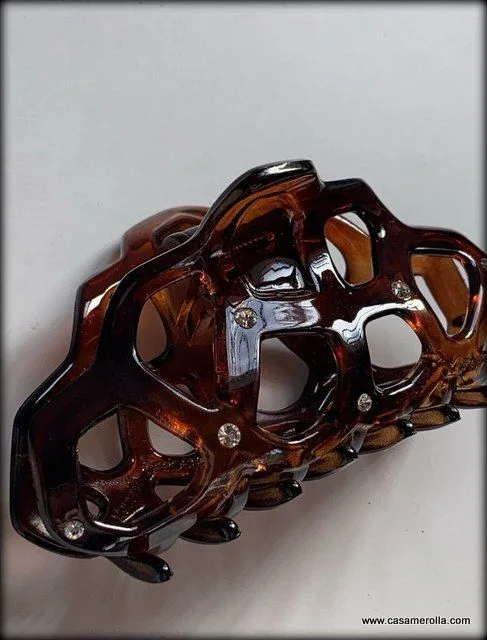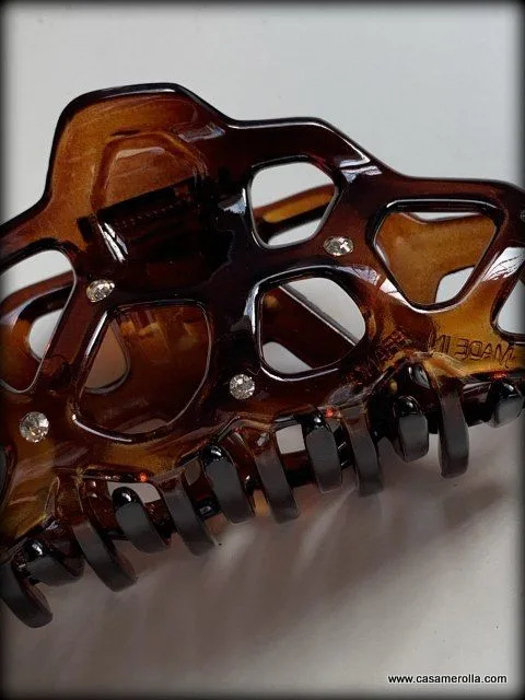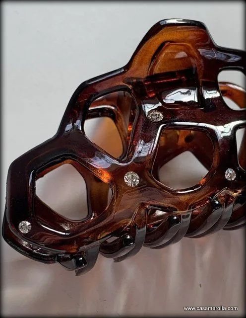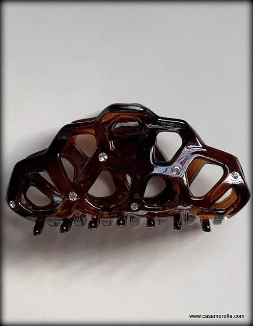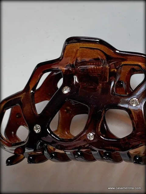 Pinza para cabello elaborada en Carey con pedrería Swarowski . Articulo de alta calidad con fuerte agarre de pelo, hecho en Francia. Medida: 9,0 cm.